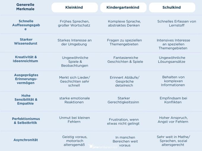 The table shows an overview of the general characteristics of giftedness and their typical manifestations in toddlers, kindergarten children and schoolchildren: