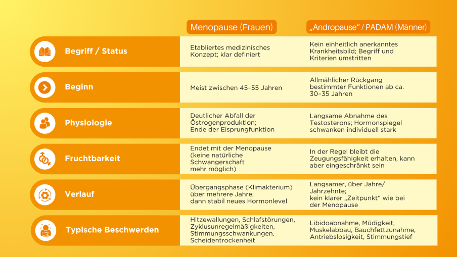 Hormones also change in men over the course of their lives. From around the age of 30 to 35, testosterone levels slowly decline on average. In technical terms, this is called "partial androgen deficiency in aging men (PADAM)", colloquially sometimes referred to as "andropause".